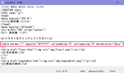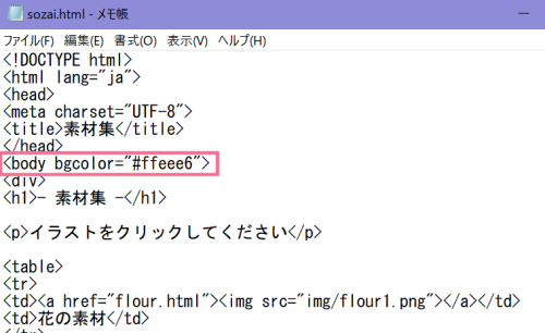 「sozai.html」を開き<body>に背景色を指定します。