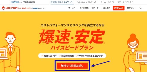 ロリポップ!のトップページから「無料で10日間お試し」ボタンをクリック