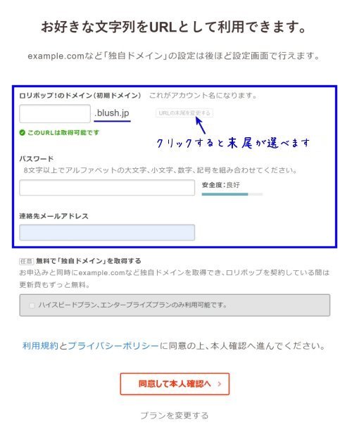 好きなドメイン名を入力して、URLの末尾を選びます。