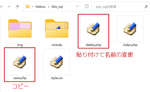 save.php をコピーして貼り付け、名前を delete.php に変更します。