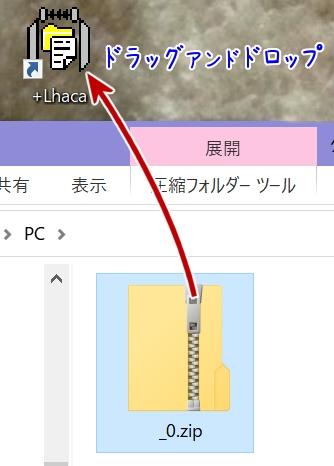 圧縮ファイル(zip、lzh など)を、デスクトップのアイコンにドラッグアンドドロップします。