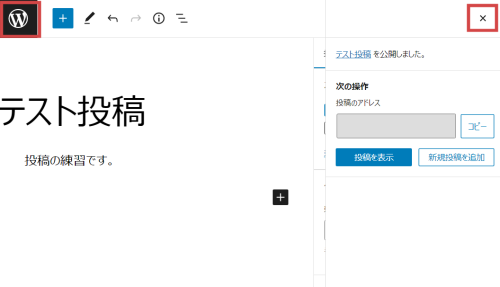 投稿後、×をクリックしてWordPressのアイコンをクリック