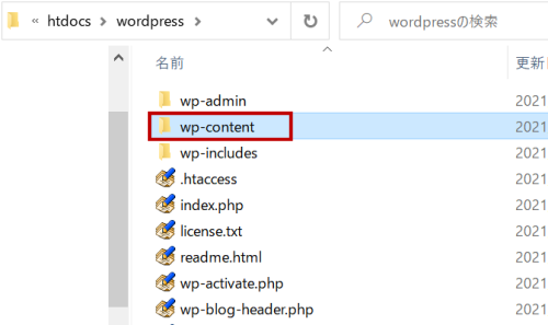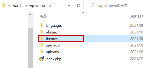 「Apache」-「htdocs」-「wordpress」-「wp-content」-「themes」にフォルダを作ります。