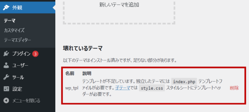 この状態で、Wordpressの「外観」を確認すると、スタイルシートが足りないと表示されます。